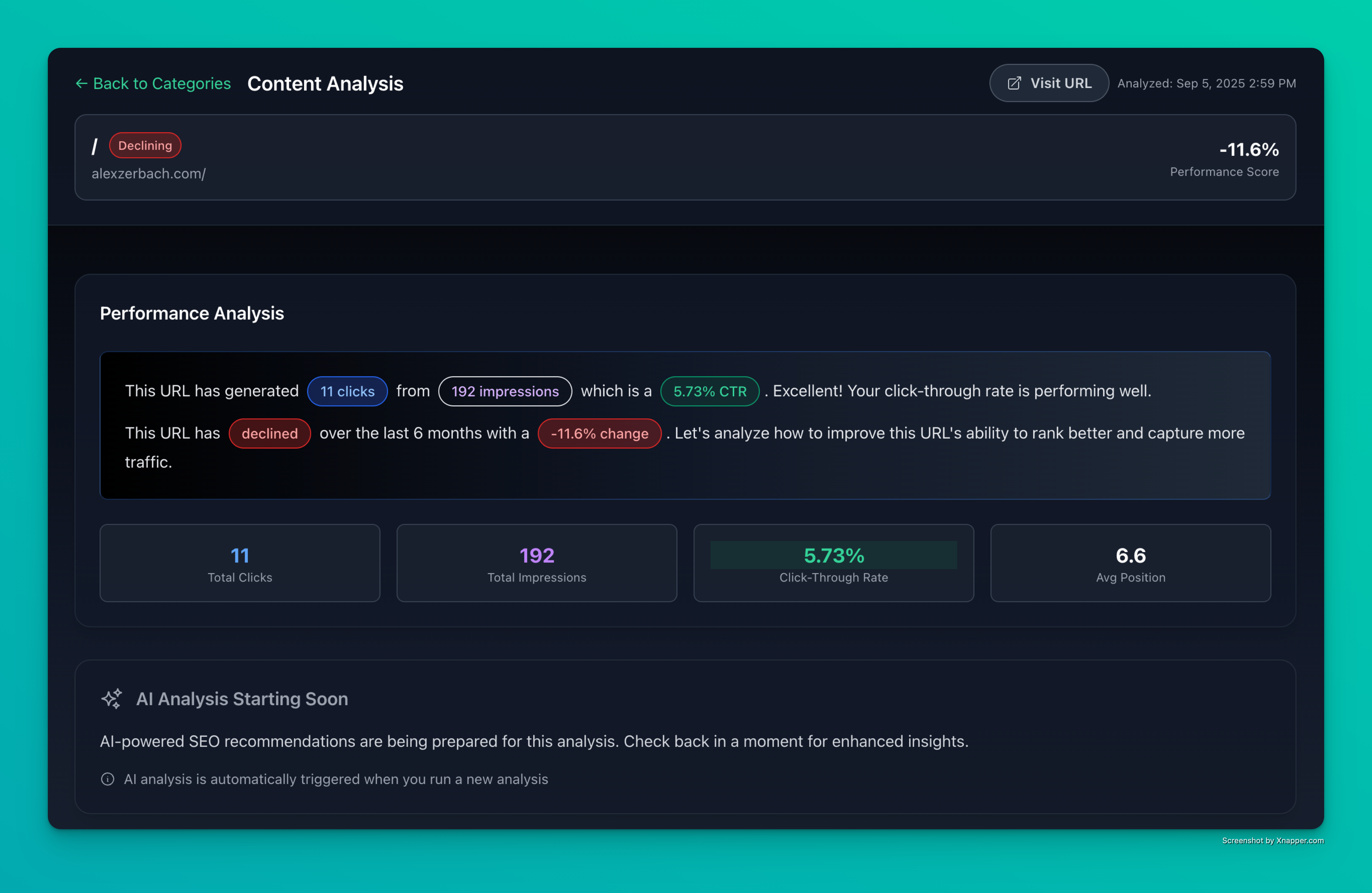 From there, you can click into any URL to run a one-off report. That fetches the top three competitors ranking for that query, compares their content to yours (word count, headings, content depth, etc.), and generates recs for how to improve.